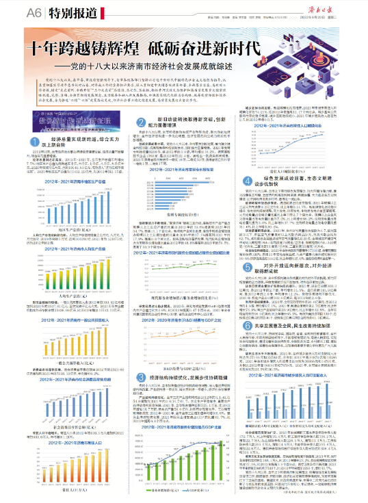 为有效展现党的十八大以来济南市经济社会发展取得突破性进展和历史性变革,为推动新时代社会主义现代化强省会建设作出积极贡献,以实际行动向党的二十大献礼,济南市统计局按照《济南市庆祝第十三届统计开放日活动方案》安排,撰写了题为《十年跨越铸辉煌 砥砺奋进新时代----党的十八大以来济南市经济社会发展成就综述》的文章,并于9月20日当天在济南日报发表。 文章重点阐述了党的十八大以来济南市经济总量实现新跨越、新旧动能转换取得新突破、经济结构持续优化、绿色发展成效显著以及对外开放迈向新层次、共享发展惠及全民等六个方面,用统计数据直观的展现了2012年-2021年十年之间济南市翻天覆地变化以及取得的令人瞩目的成就。 下一步市统计局将通过编印庆祝第十三届统计开放日系列汇报材料,录制人大代表、政协委员、退休老干部、基层统计站长、企业代表访谈节目等方式,开展一系列庆祝活动,进一步传播统计文化、提升统计形象、树立统计权威,促进社会公众关注认识统计、配合支持统计,凝聚统计事业发展正能量,激发干事担当新作为。
