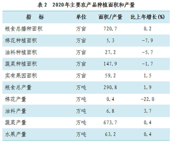 三、农业 农业经济综合保障能力不断增强。全年农林牧渔业总产值671.7亿元,比上年增长2.6%;农林牧渔业增加值380.3亿元,增长2.3%。粮食总产量290.8万吨,增长1.9%;蔬菜总产量673.7万吨,增长0.4%;油料总产量6.8万吨,增长3.7%;水果总产量63.2万吨,增长0.4%。