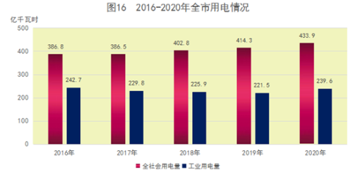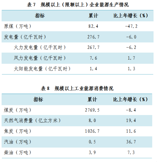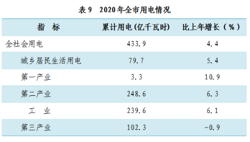 十一、能源、环境、城市建设[8]和安全生产 绿色低碳能源体系建设取得积极进展。煤炭消费压减工作成效显著,规模以上工业煤炭消费2769.5万吨,下降8.4%;天然气消费8.0亿立方米,增长19.4%,煤减气增,清洁能源消费占比逐步提高。规模以上工业能源加工转换效率比上年提高0.5个百分点,其中炼焦效率提高2.9个百分点,供热效率提高0.9个百分点,炼油效率提高0.1个百分点。新能源生产方兴未艾,规模以上企业风力发电7.6亿千瓦时,增长1.7%,占发电总量的2.8%;太阳能发电1.4亿千瓦时,增长1.3%,占发电总量的0.5%;垃圾发电6.9亿千瓦时,增长23.5%,占发电总量的2.5%。 全市用电稳步增长。全社会用电433.9亿千瓦时,比上年增长4.4%,其中,居民生活用电79.7亿千瓦时,增长5.4%。分产业看,第一产业用电3.3亿千瓦时,增长10.9%;第二产业用电248.6亿千瓦时,增长6.3%,其中,工业用电239.6亿千瓦时,增长6.1%;第三产业用电102.3亿千瓦时,下降0.9%。