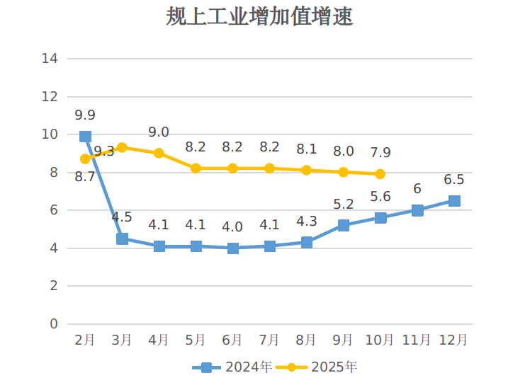 规模以上工业增加值 指 标 | 1-10月累计 同比±% | 总计 | 7.9 | 按经济性质分:公有制 | 11.0 | 非公有制 | 5.9 | 按轻重工业分:轻工业 | -2.9 | 重工业 | 10.8 |