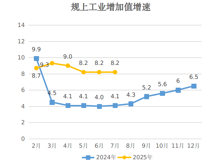 规模以上工业增加值 指 标 | 1-7月累计 同比±% | 总计 | 8.2 | 按经济性质分:公有制 | 10.8 | 非公有制 | 6.6 | 按轻重工业分:轻工业 | -3.3 | 重工业 | 11.4 |